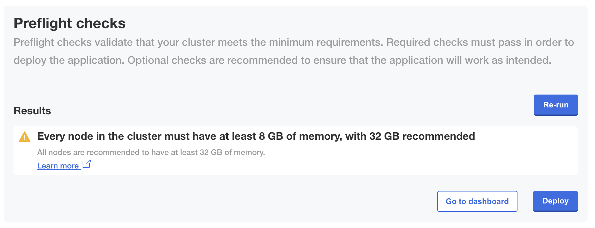 The following shows how a warn outcome for this preflight check is displayed in the Admin Console during KOTS installation or upgrade: